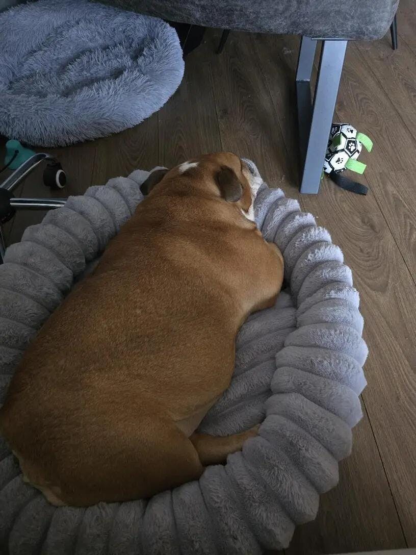 Suczka ma lęki separacyjne, a w tym legowisku szybciej się uspokaja. Wygląda na bezpieczną.